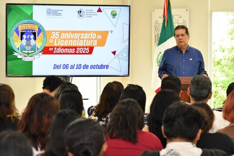 El 35 aniversario de la Licenciatura en Idiomas de la UJAT reafirma el compromiso de la Universidad Juárez Autónoma de Tabasco con la formación de profesionales capaces de unir culturas y destacar en el ámbito global, señaló el rector Guillermo Narváez Osorio, durante la inauguración de los festejos realizados en la División Académica de Educación y Artes (DAEA).