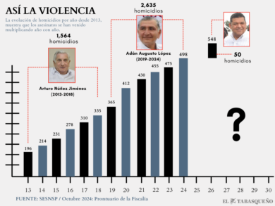 Según el Secretariado Ejecutivo del Sistema Nacional de Seguridad Pública (SESNSP), los homicidios crecieron año tras año. En 2013, durante el inicio del gobierno de Núñez, Tabasco registró 196 asesinatos. Para septiembre de 2024, esa cifra había superado los 500 homicidios, consolidando una tendencia sostenida que refleja la incapacidad de las administraciones para frenar la violencia.