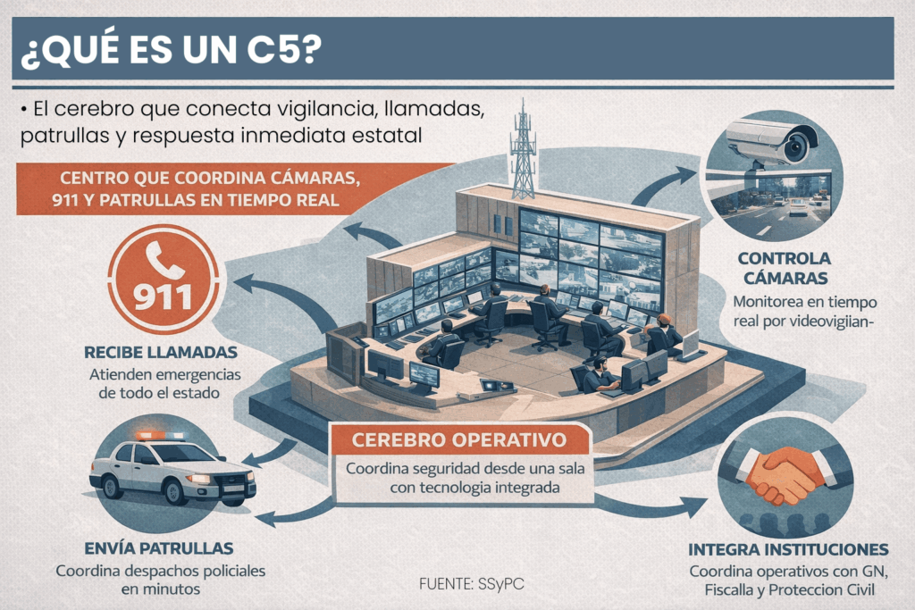 Un C5 es el punto donde se concentran todas las decisiones operativas de la seguridad pública. No es una corporación ni sustituye a la policía: es el cerebro que organiza la información.