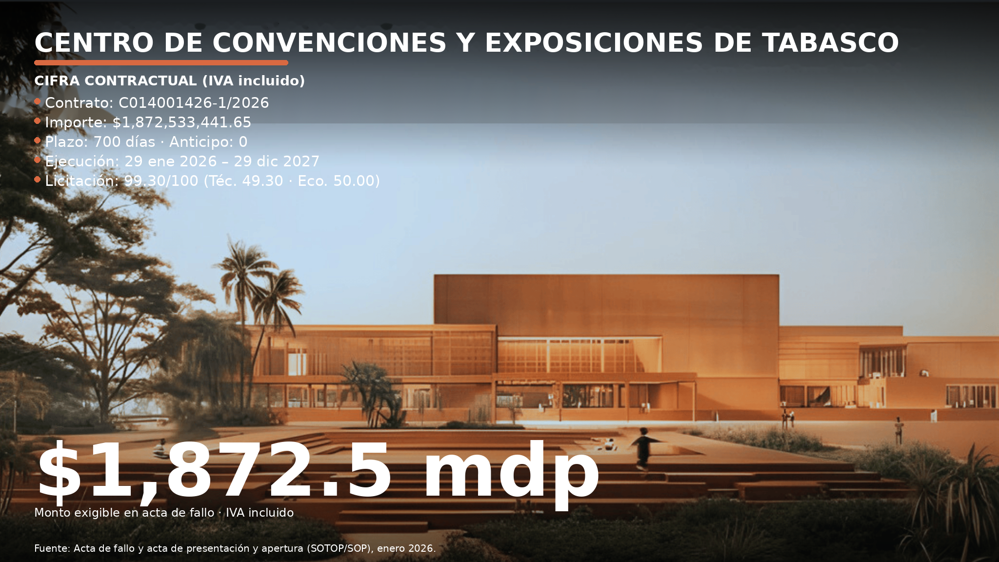El número que realmente importa no es redondo ni simbólico. No son “2 mil millones”. El contrato firmado para el nuevo Centro de Convenciones y Exposiciones de Tabasco fija 1,872 millones de pesos con IVA incluido. Esa es la cifra legal, presupuestal y exigible que quedó asentada en actas públicas.