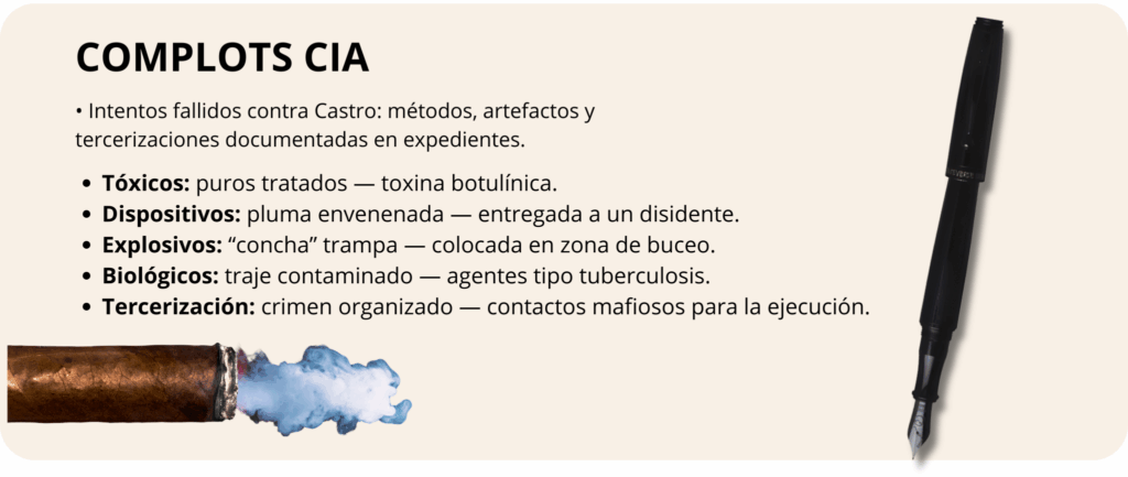 De los puros a la “concha” explosiva: cuando el asesinato era opción. Tras el fracaso, la CIA mutó de desembarcos a micro-ingeniería letal. Al menos ocho complots contra Castro desfilan por informes: puros con toxina botulínica, plumas envenenadas, una “concha marina exótica” cargada de explosivos en el sitio de buceo del líder, hasta un traje de buceo contaminado con bacterias tipo tuberculosis. Hubo contactos con la mafia para “tercerizar” la operación. Nada funcionó. El “enemigo” no cayó; se consolidó.