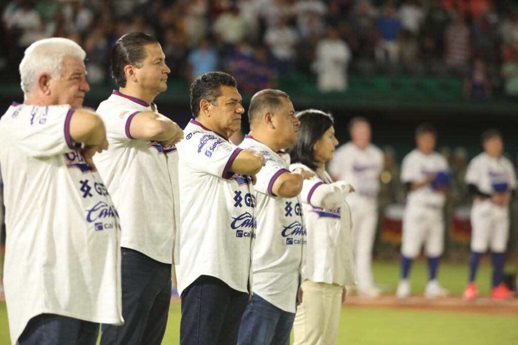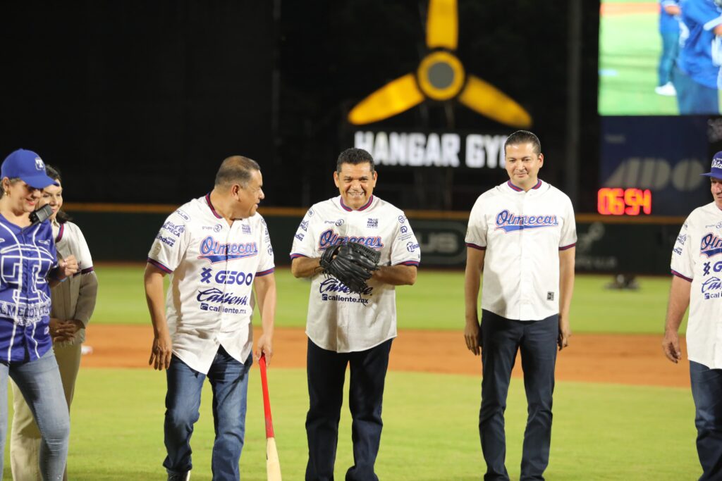 En el centro del diamante, Javier May Rodríguez tomó la pelota con esa mezcla de protocolo y exposición que tiene el primer lanzamiento, acompañado por Daniel Gómez Arellano y el cátcher Alan Espinosa, quienes completaron una postal donde el beisbol se cruza inevitablemente con la política pública y la vida cotidiana.